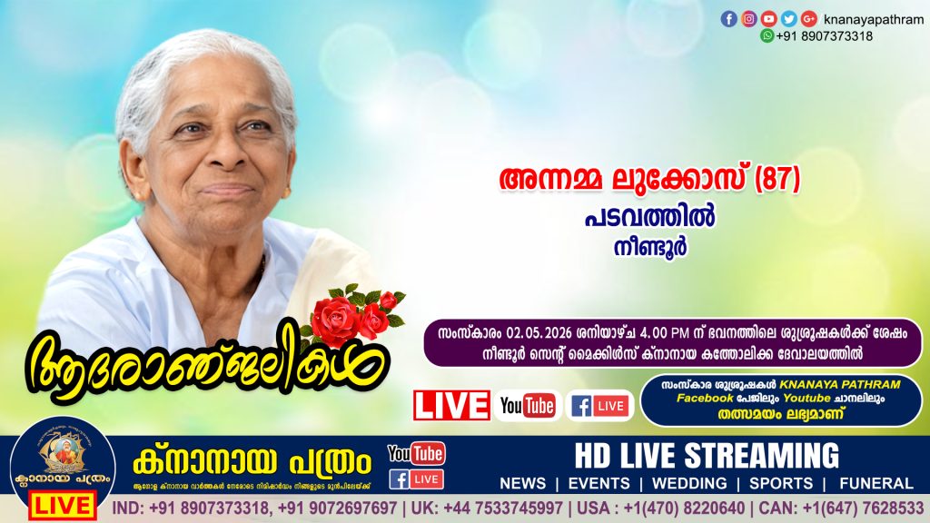 കുറുപ്പന്തറ (കോതനല്ലൂർ) ഞരളക്കാട്ട്തുരുത്തിൽ ജോസ് എൻ.എ. യുടെ ഭാര്യ ചിന്നമ്മ ജോസ് (70) നിര്യാതയായി. സംസ്കാരം 01.05.2026 വെള്ളിയാഴ്ച