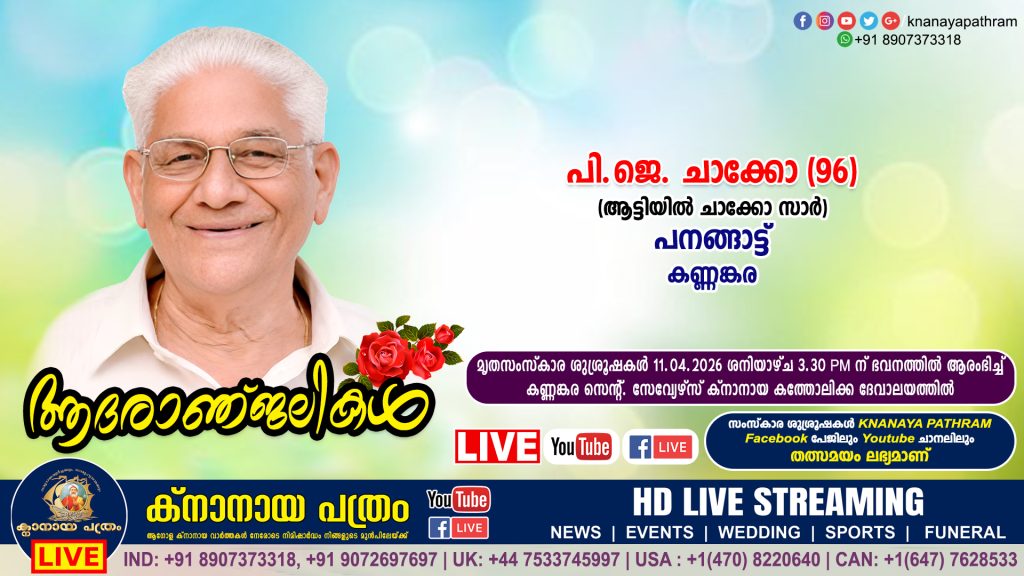 കണ്ണങ്കര പനങ്ങാട്ട് പി.ജെ. ചാക്കോ (ആട്ടിയിൽ ചാക്കോ സാർ - 96) നിര്യതനായി. സംസ്കാരം 11.04.2026 ശനിയാഴ്ച 3.30