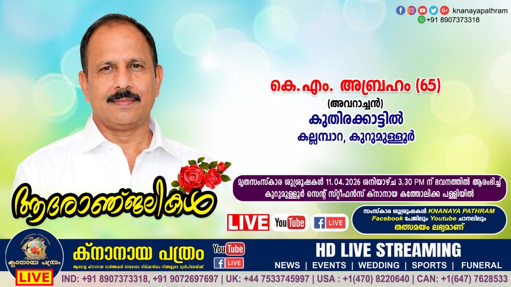 കുറുമുള്ളൂർ കല്ലമ്പാറ കുതിരക്കാട്ടിൽ കെ.എം. അബ്രഹം (അവറാച്ചൻ - 65) നിര്യാതനായി. സംസ്കാരം 11.04.2026 ശനിയാഴ്ച 3.30 pm ന്