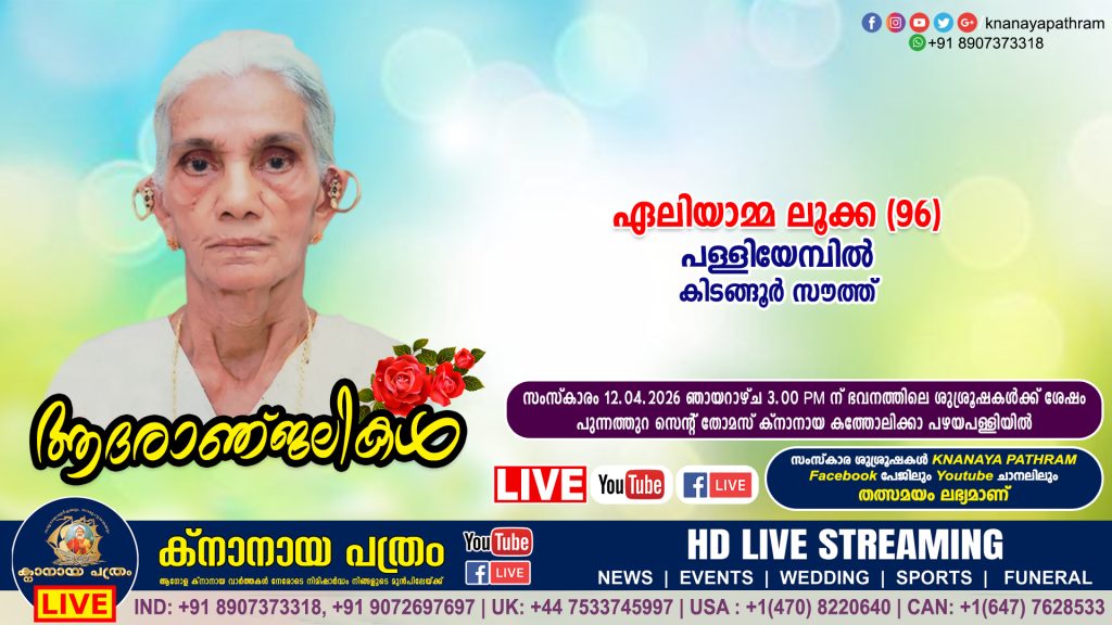 കിടങ്ങൂർ സൗത്ത് പള്ളിയേമ്പിൽ പരേതനായ ലൂക്കായുടെ ഭാര്യ ഏലിയാമ്മ ലൂക്ക (96) നിര്യാതയായി. സംസ്കാരം 12.04.2026 ഞായറാഴ്ച 3.00
