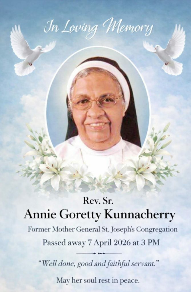 റവ.സി. ആനി ഗൊരേത്തി കുന്നശേരി നിര്യാതയായി . മ്യതസംസ്ക്കാരം പിന്നീട് . സെൻ്റ് ജോസഫ് സഭയുടെ മുൻ വികാരി