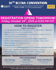 ഡാളസ്: വടക്കേ അമേരിക്കയിലെ ക്നാനായ സമുദായം വളരെയേറെ ആവേശത്തോടെ കാത്തിരിക്കുന്ന ഫ്ലോറിഡയിലെ ഫോർട്ട് ലോഡർഡെയിലെ ബ്രോവാർഡ് കൗണ്ടി കൺവെൻഷൻ സെൻറ്ററിൽ 2026 ആഗസ്റ്റ് 6 മുതൽ 10 വരെ നടക്കുന്ന 16-ാമത് കെ.സി.സി.എൻ.എ നാഷണൽ കൺവെൻഷൻറെ രെജിസ്ട്രേഷൻ ഒക്ടോബർ 24 വെള്ളിയാഴ്ച വൈകിട്ട് 8 മണിക്ക് (സെൻട്രൽ ടൈം) ആരംഭിക്കുമെന്ന് കെ.സി.സി.എൻ.എ ജനറൽ സെക്രട്ടറി വിപിൻ ചാലുങ്കൽ അറിയിച്ചു. ഓംനി ഹോട്ടലിലെ റൂമുകൾ പരിമിതമായതിനാൽ, പ്രത്യേകിച്ച് ഡബിൾ/ക്വീൻ റൂമുകൾ, പണം അടച്ച ക്രമത്തിൽ ആദ്യം രജിസ്റ്റർ ചെയ്യുന്നവർക്ക് മുൻഗണനാ അടിസ്ഥാനത്തിൽ അനുവദിക്കുന്നതാണ്.