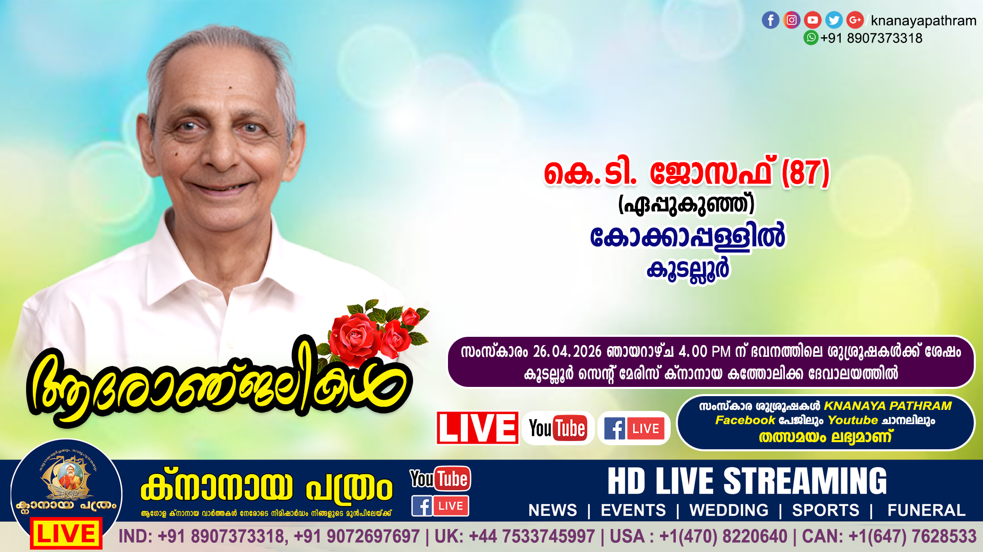 കൂടല്ലൂർ കോക്കാപ്പള്ളിൽ കെ.ടി. ജോസഫ് (ഏപ്പുകുഞ്ഞ് – 87) നിര്യാതനായി. സാംസ്കാരം 26.04.2026 ഞായറാഴ്ച 4 pm ന് ഭവനത്തിൽ ആരംഭിച്ച്, കൂടല്ലൂർ സെന്റ് മേരിസ് ക്നാനായ കത്തോലിക്ക ദേവാലയത്തിൽ.