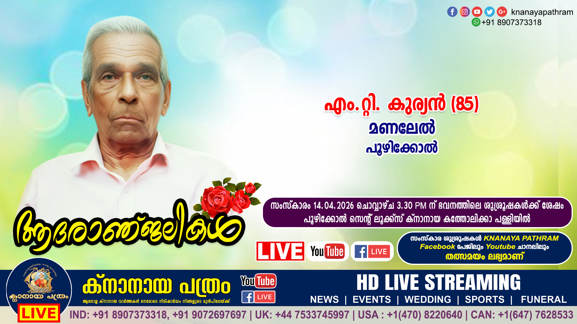 പൂഴിക്കോൽ മണലേൽ എം.റ്റി. കുര്യൻ (85) നിര്യാതനായി. LIVE FUNERAL TELECASTING AVAILABLE