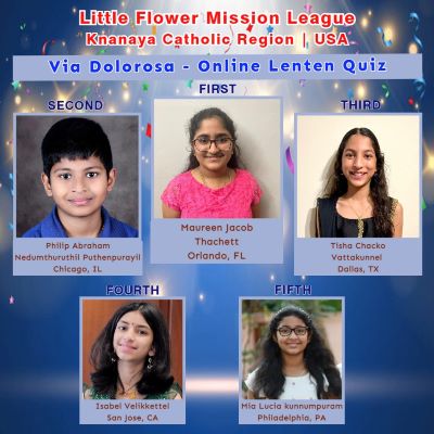 ചിക്കാഗോ: ചെറുപുഷ്പ മിഷൻ ലീഗ് ക്നാനായ റീജിയണൽ കമ്മിറ്റി “വയാ ഡോളോറോസ” എന്ന പേരിൽ ഓൺലൈൻ നോമ്പുകാല ക്വിസ് മത്സരം സംഘടിപ്പിച്ചു. ഫ്ലോറിഡയിലെ ഒർലാണ്ടോ സെന്റ് സ്റ്റീഫൻസ് ക്നാനായ കത്തോലിക്ക പള്ളിയിലെ മൗറീൻ ജേക്കബ് തച്ചേട്ട് ഒന്നാം സ്ഥാനം നേടി.